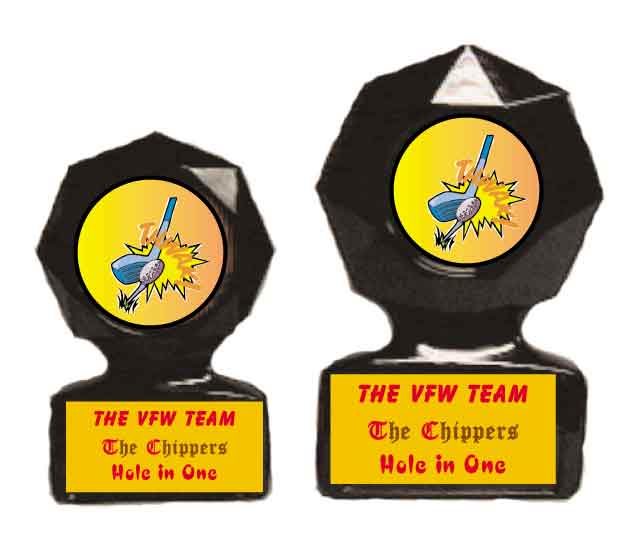 Golf awards with medals, resin figures, trophy lamps, plaques, hole in one awards.